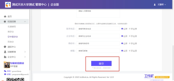 上传完成后点击最下方【提交】按钮,等待高校审核,审核通过后即发布成功,审核结果可在【空中宣讲会】。