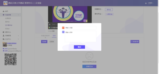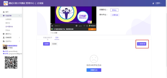 用人单位可在已上传的【空中宣讲会】下方点击【互动】,在互动列表中点击【新增问答】按钮,设置学生可能问到的高频问题。