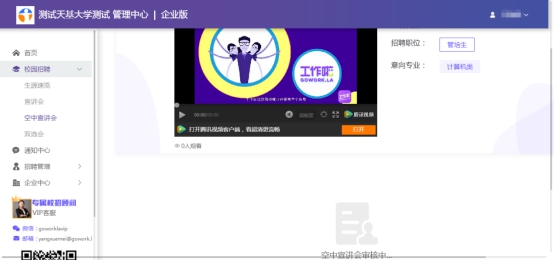 该功能打通腾讯视频全生态,用人单位登录我校就业信息网注册审核后,可通过复制空中宣讲会的腾讯视频链接上传空中宣讲会视频,并申请参加我院空中宣讲会。经过我校审核通过的用人单位空中宣讲会视频将在本校就业信息网呈现,用人单位还可在后台查看学生简历,进行在线互动等。空中宣讲会发布分为上传宣讲会视频至腾讯视频、发布空中宣讲会、等待审核,审核通过的空中宣讲会将推荐至就业信息网首页和学生求职小程序,具体操作步骤如下: