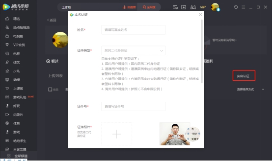 第1步:下载腾讯视频客户端,注册登录完成实名认证。