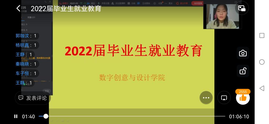 2021年12月7日,数字创意与设计学院2022届毕业生就业思想教育在线上举行如期进行。学习主题为24365平台上的精品课程《基层就业、成就梦想》,课程介绍了基层工作的范畴、政策、困难、及案例,学院500余名各专业毕业生参加钉钉直播会。