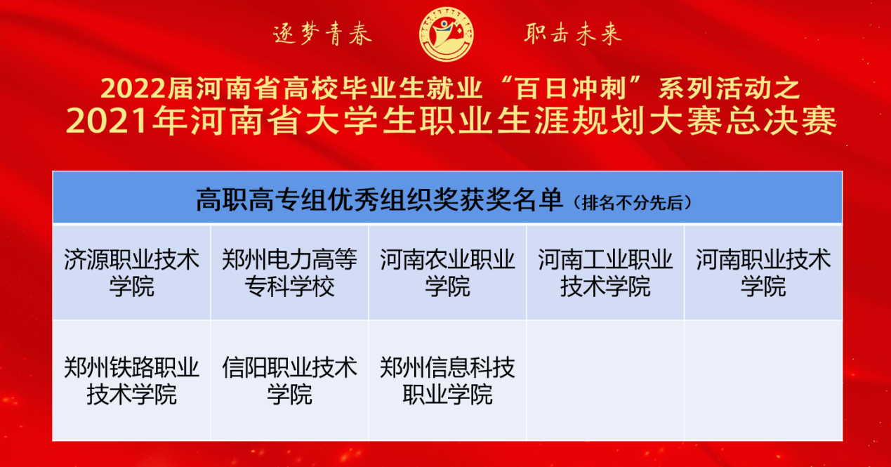 5月20日,由河南省教育厅、河南省发展和改革委员会等七部门共同主办,郑州大学、河南省大中专学生就业服务中心共同承办的2021年全省大学生职业生涯规划大赛总决赛落下帷幕。我院四位选手在大赛中脱颖而出取得一金三银佳绩,智能制造学院周升甲获得金奖和“规划之星”称号,智慧健康学院排尔哈提·约麦尔、韩天宇、现代信息技术学院陈浩获得银奖,我校获得“高职高专组优秀组织奖”。