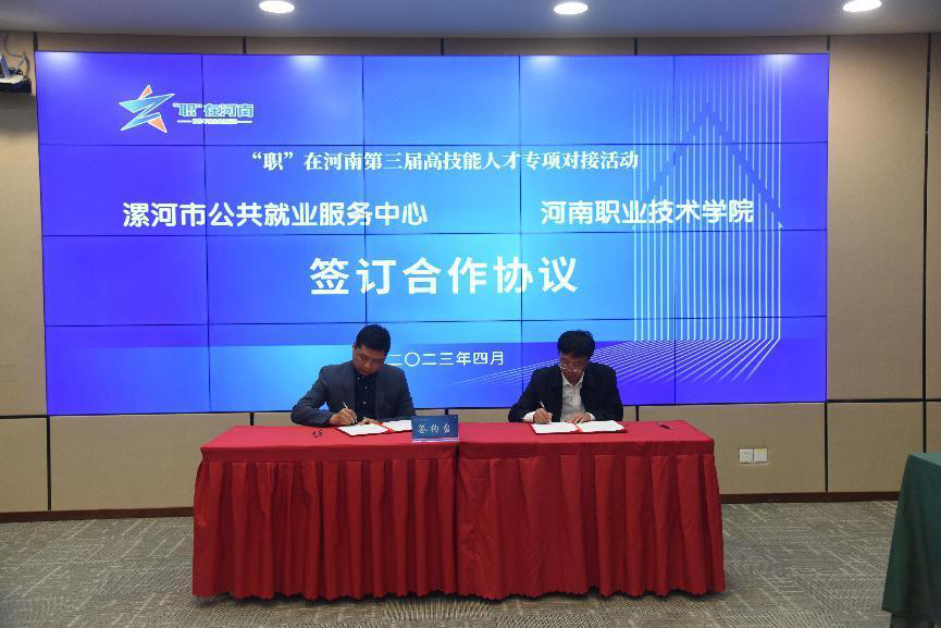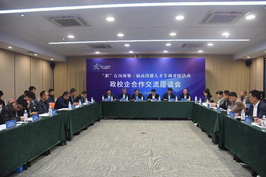 在高技能人才对接交流座谈会上,校长梅乐堂和代勇、赵杰、崔秀池、夏喜利,同郑州、开封、洛阳和平顶山等14个地市公共就业服务机构及13家用人单位进行座谈。梅乐堂希望,校、政、企三方深化交流与合作,共同搭建人才互动、资源互通的交流对接平台,培育更多适应我省现代产业体系发展的高素质复合型、实践型、创新型技术技能人才,积极助力毕业生充分就业、企业创新发展和河南经济建设。会上,学校还与参会的公共就业服务机构和就业单位分别签订了相应的人才供需对接合作协议。