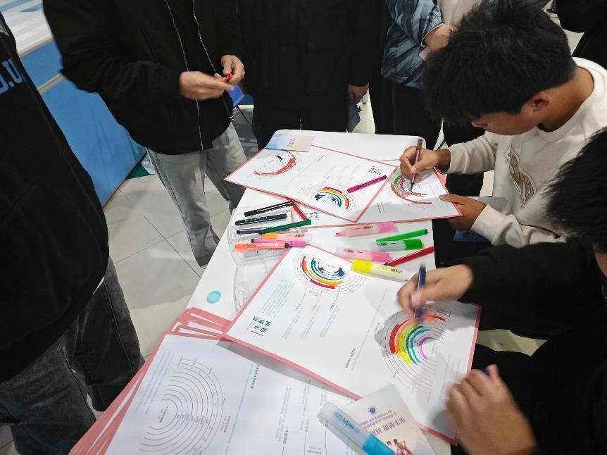 本次活动设置了生涯彩虹图、套圈小游戏、简历制作等项目。生涯彩虹图直观地展现了人生各个阶段与职业发展的关联,学生在分析和绘制的过程中,可以深入思考不同人生阶段的职业角色;套圈小游戏则巧妙地将不同职业信息融入其中,让学生在轻松愉快的氛围中了解各种职业类型;简历制作环节则通过实际操作,让学生了解简历撰写技巧,根据自己的兴趣和职业规划,选择合适的信息填写简历,初步掌握求职技能。与此同时,在职业与学业规划知识展示区的大屏幕上滚动播放着学校优秀毕业生的职业规划和学业规划案例,为学生们提供了宝贵的经验和参考。活动现场,职业生涯规划老师耐心地解答学生们的困惑,学生们积极参与,现场气氛热烈。