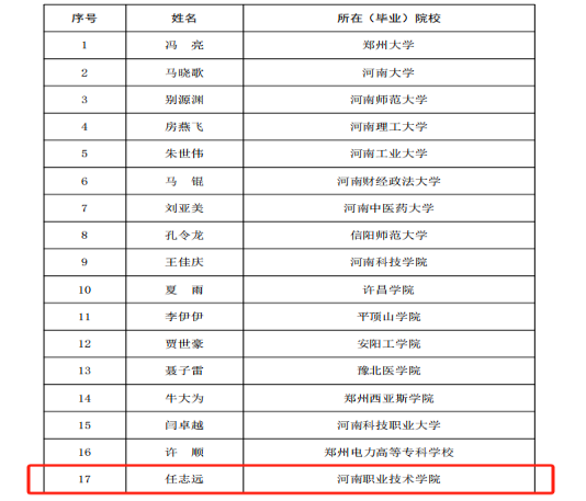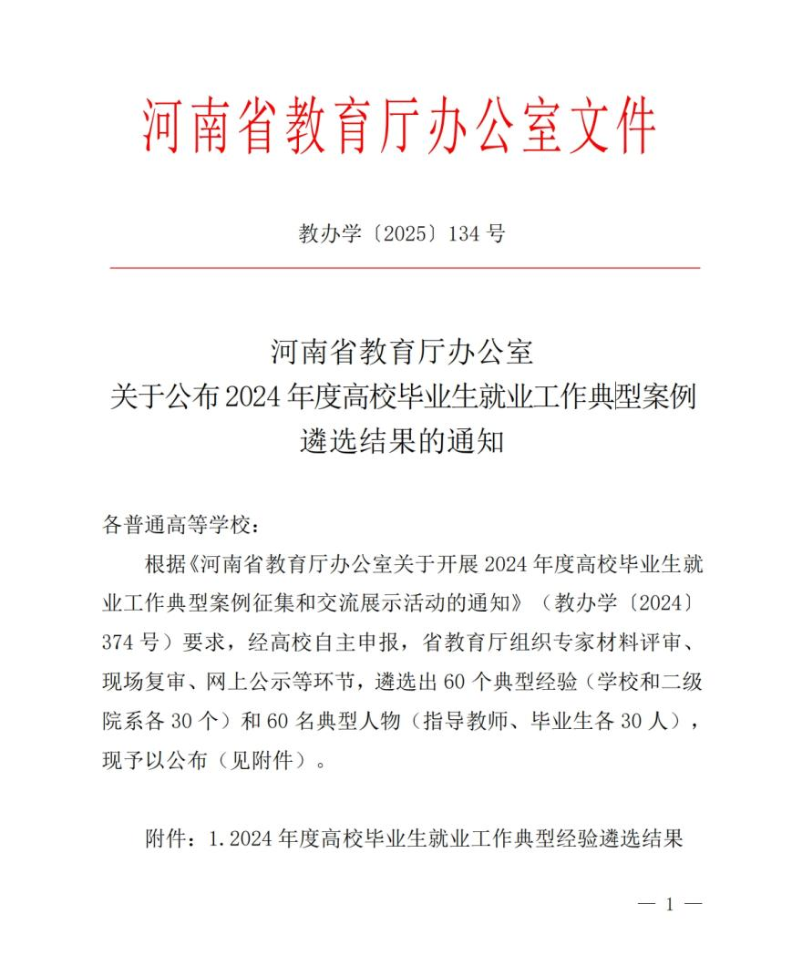 近日,河南省教育厅公布了“2024年度高校毕业生就业工作典型案例遴选结果”名单,现代信息技术学院的《凝心聚力重点群体 多措并举暖心帮扶》获评院系级典型经验案例、王林老师荣获“就业工作典型人物(指导教师)”称号、任志远荣获“就业工作典型人物(毕业生)”称号、充分彰显了学校在毕业生就业工作方面的突出成效和示范引领作用。