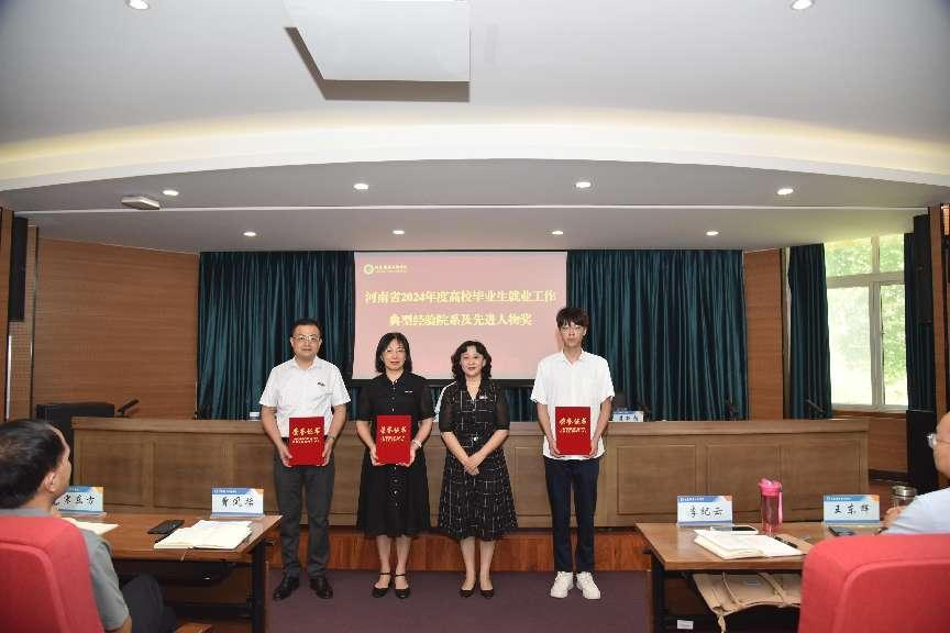 会议对“第二届全国职业规划大赛国赛及省赛获奖选手及指导教师”“河南省2024年度高校毕业生就业工作典型经验获奖院系和先进人物”“2024年度毕业生就业工作先进集体和先进个人”进行了表彰和颁奖。
