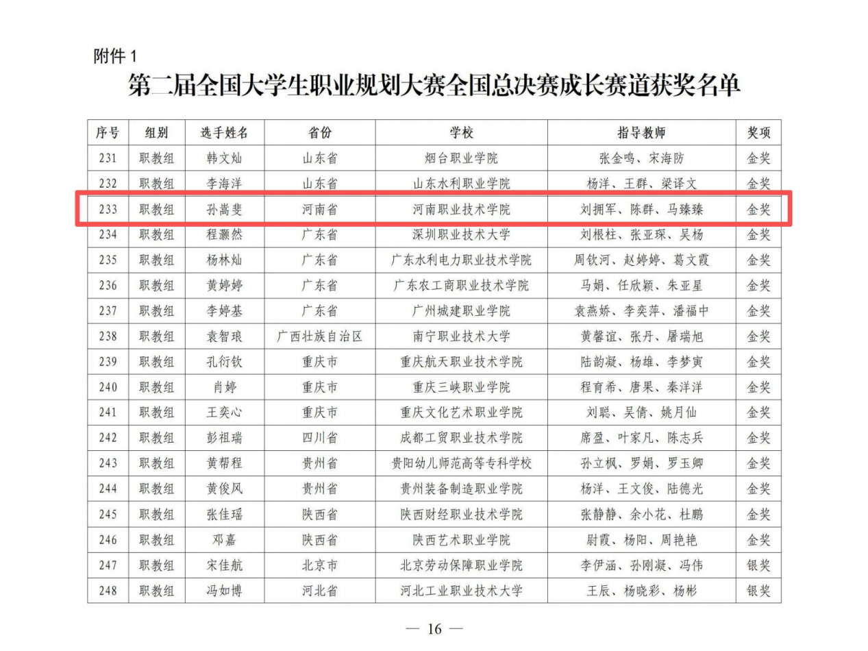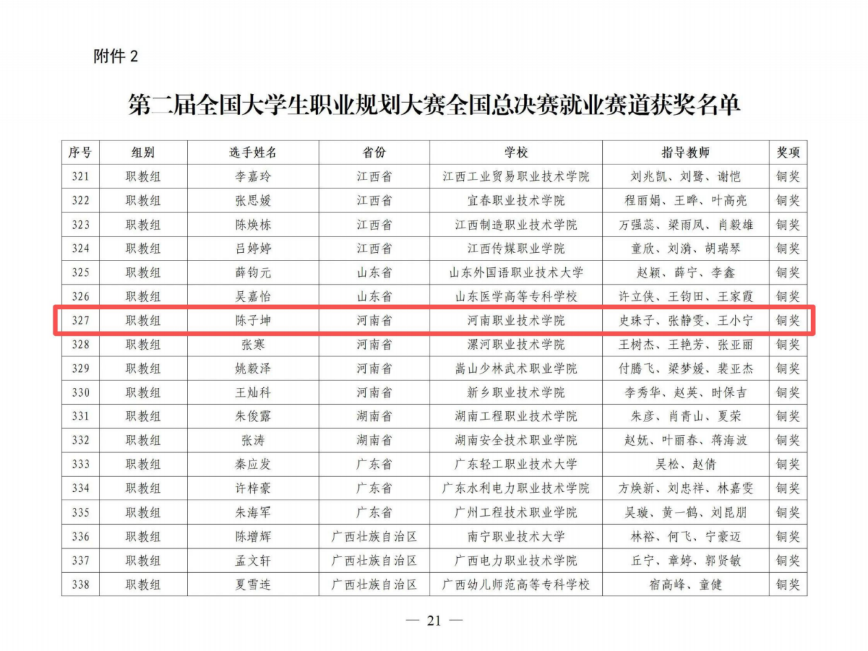 本次大赛由教育部与湖南省人民政府共同主办,以“筑梦青春志在四方,规划启航职引未来”为主题,吸引全国超百万大学生参与。河南省共获46个奖项,我校在该项赛事中取得了历史性突破!